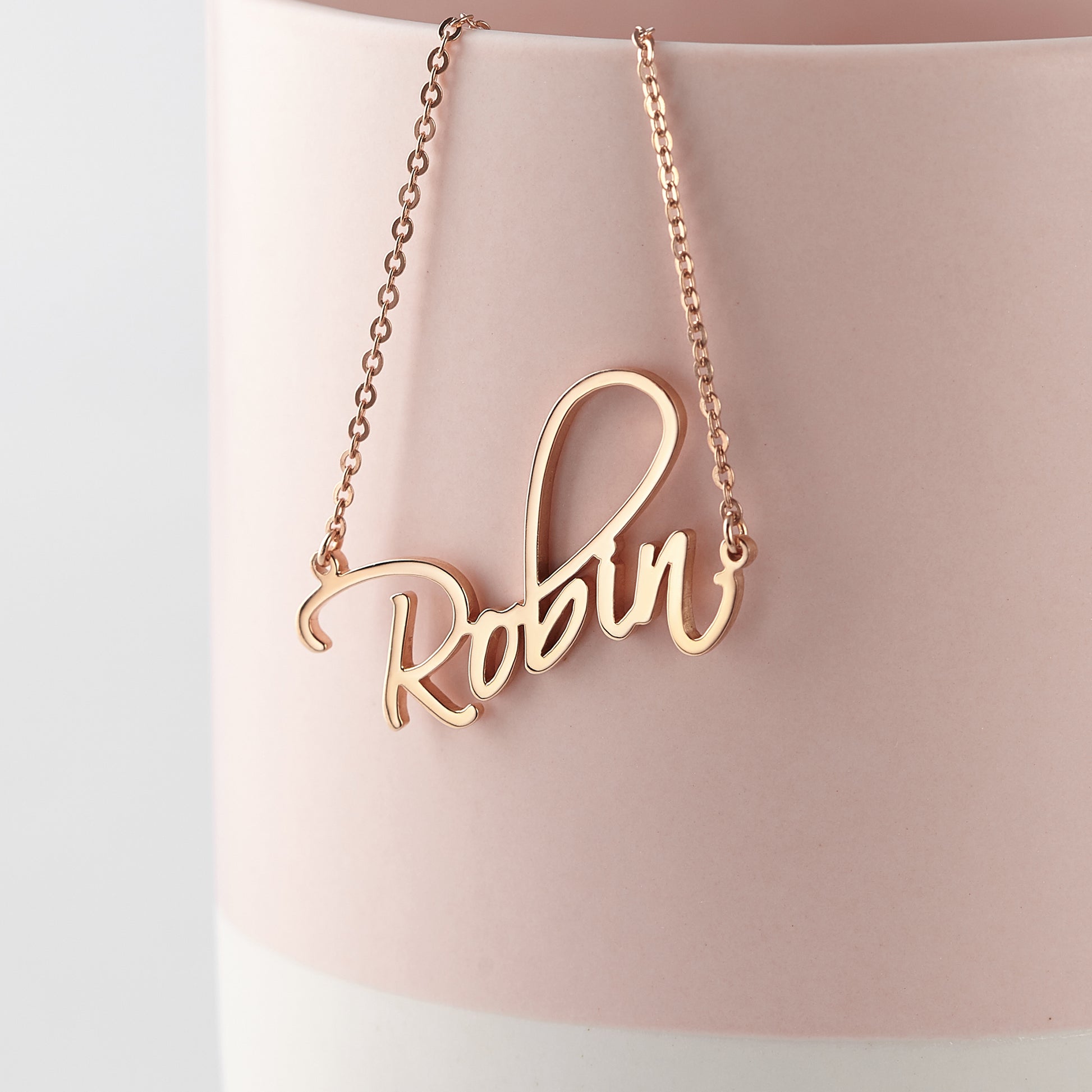Boast your name in a handwriting font! This personalized name necklace is a cute way to wear your name. Great as gift for Christmas or birthday, this name necklace is available in sterling silver or 18K yellow or rose gold plated silver.